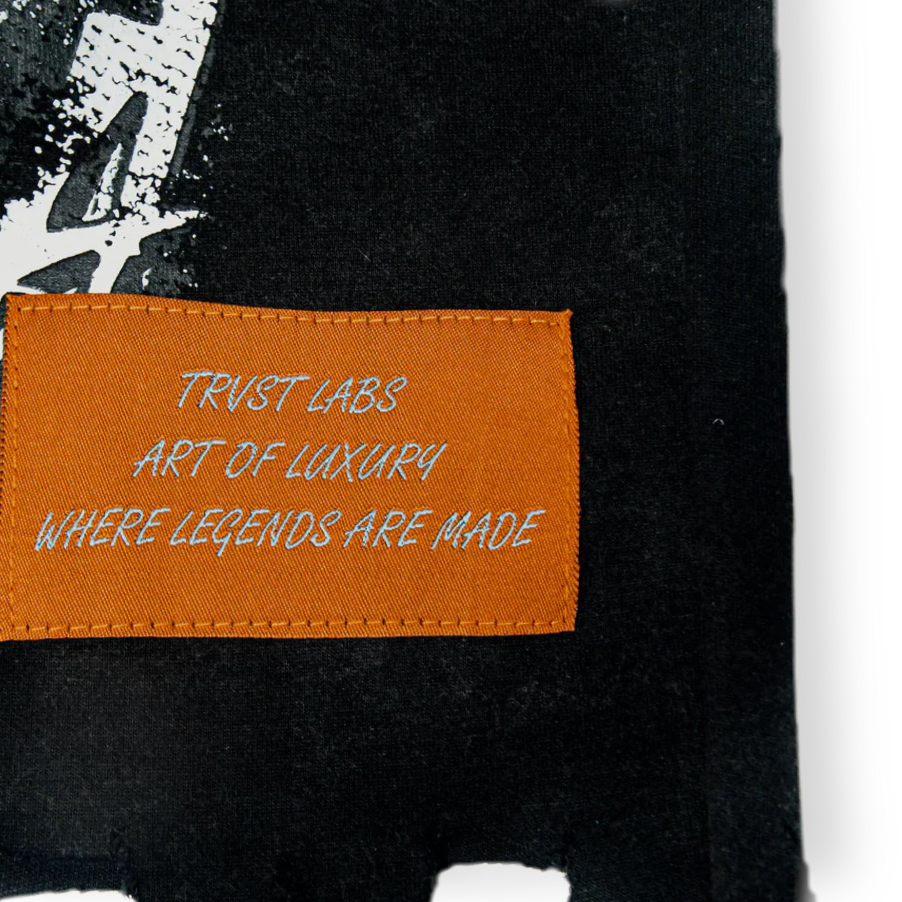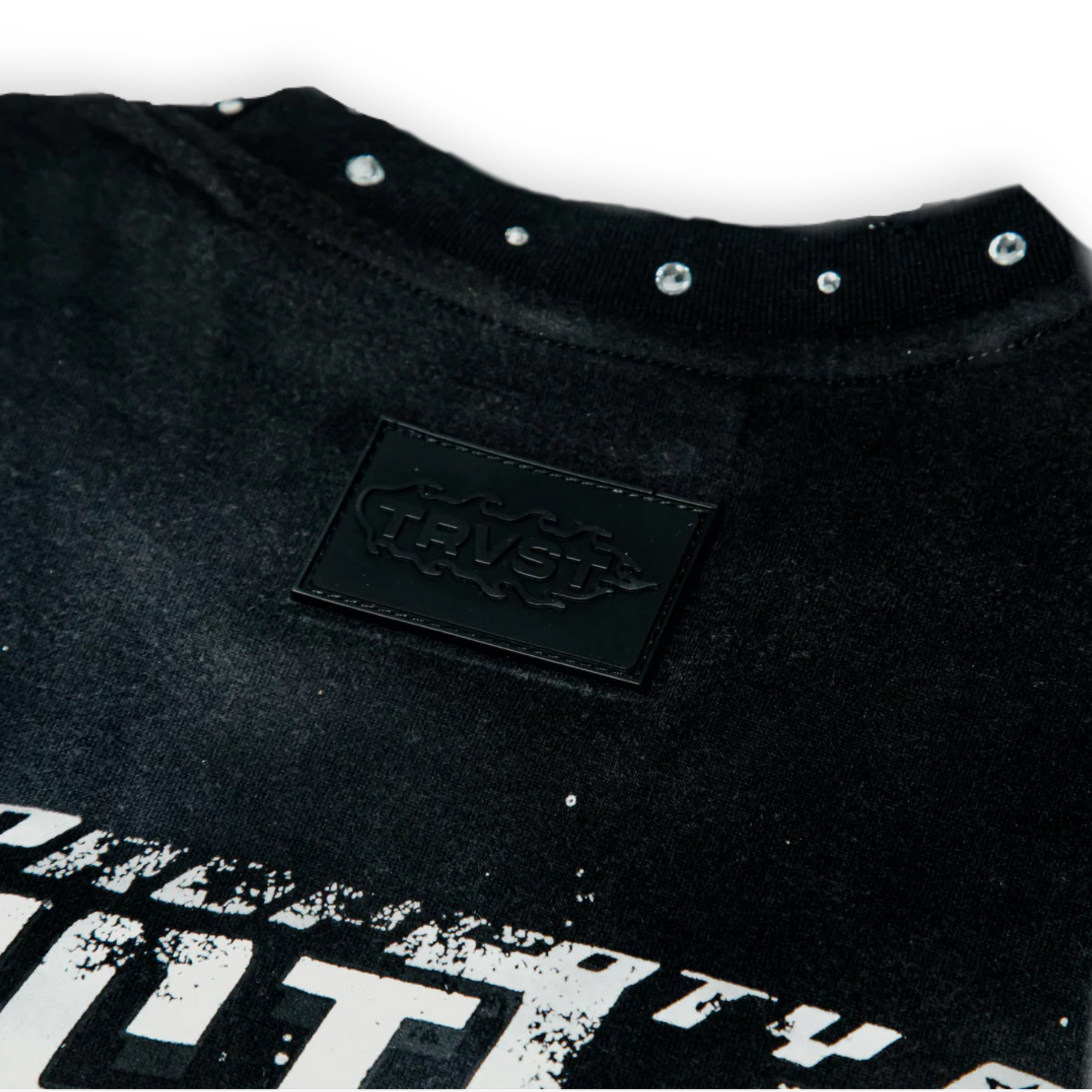 Cropped silhouette with raw distressing at neckline, armholes, and hem